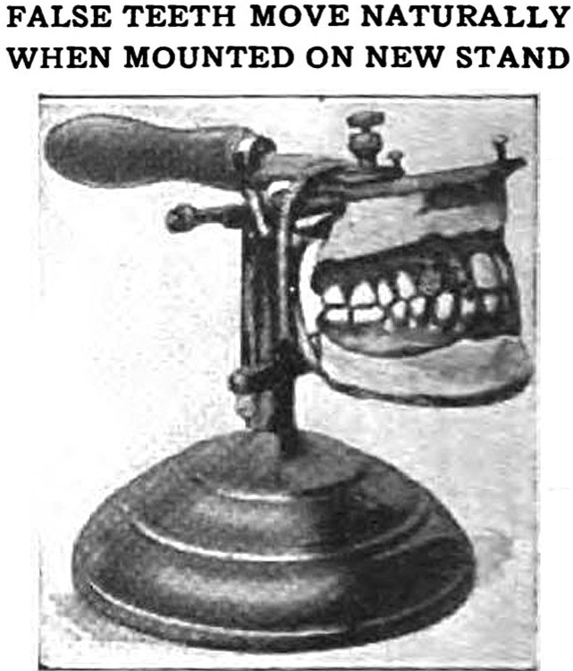 Before the wind-up false-teeth gag, "Yakity-Yak" (1950), you needed a special stand: "False teeth move naturally when mounted on new stand." From Popular Mechanics, 1920.
