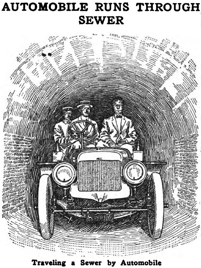"Automobile runs through sewer."  From Popular Mechanics, 1909.