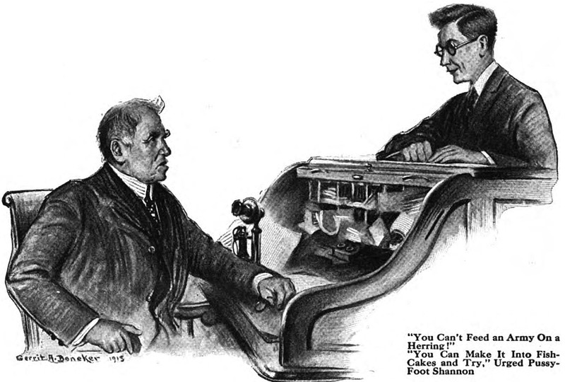 An urging from someone named Pussy-Foot: "'You can't feed an army on a herring!' 'You can make it into fishcakes and try,' urged Pussy-Foot Shannon." From Ambition magazine, 1915.