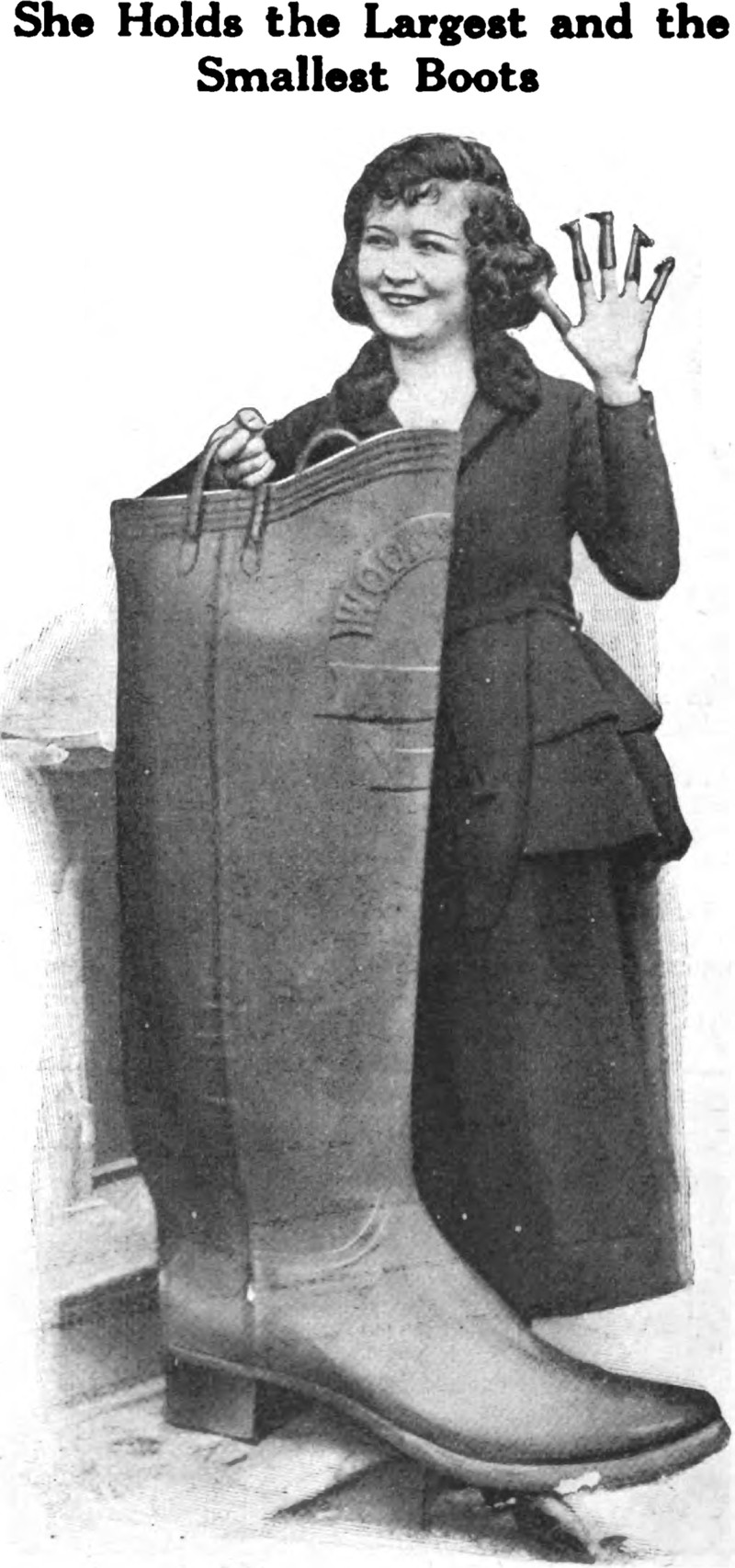 "She holds the largest and the smallest boots."  From Popular Science Monthly, 1921.