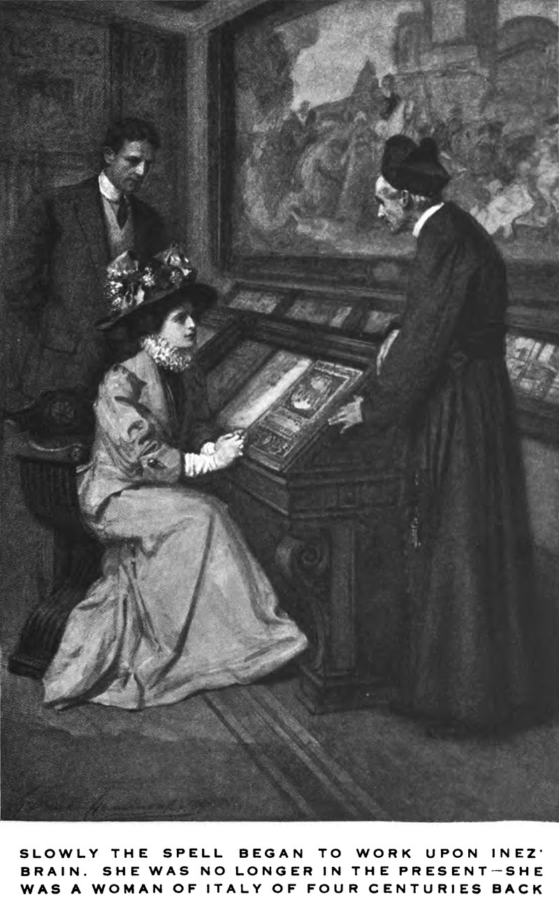 "Slowly the spell began to work upon Inex' brain. She was no longer in the present—she was a woman of Italy of four centuries back." From The Spell by William Dana Orcutt, 1909.