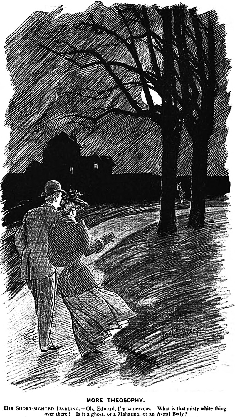 A moonlit, nervous, and short-sighted Theosophist asks, "What is that misty white thing over there? Is it a ghost, or a Mahatma, or an Astral Body?" From Pick Me Up, 1892.