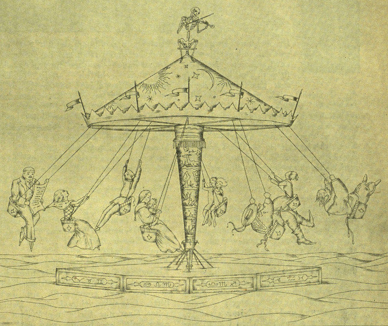 From Mocca, 1933. This other image makes an interesting pairing, with death at the top playing music and people moving in a circle below (though not on swings).