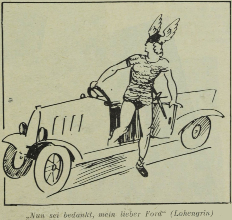 Here's a precursor to the Ford Mercury automobile, ten years before it debuted. From Die Bühne, 1928. (Indeed, it's technically Lohengrin and not Mercury thanking Mr. Ford for the ride, but that winged hat!)