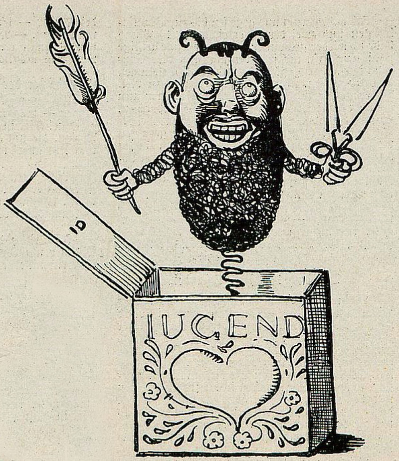 #vintage illustration #demon #imp #jack-in-the-box #scissors #quill pen #1890s #illustration