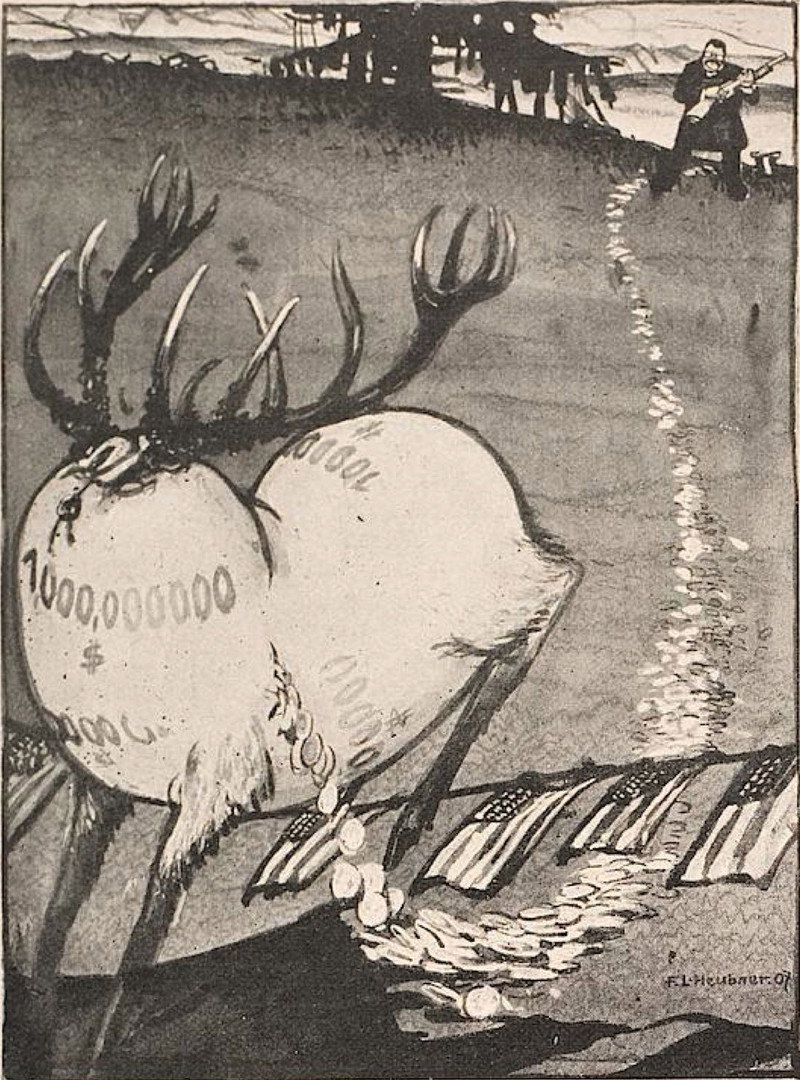 An antlered money bag takes a bullet but crosses the U.S. border.  From Jugend, 1907.