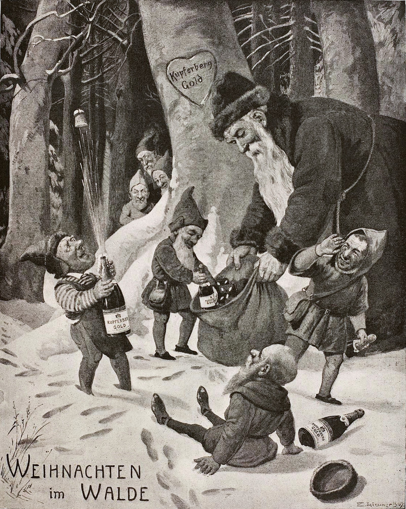 #vintage illustration #vintage ad #vintage christmas #christmas #elves #champagne #santa #popping cork #seven dwarfs #illustration #art #ad