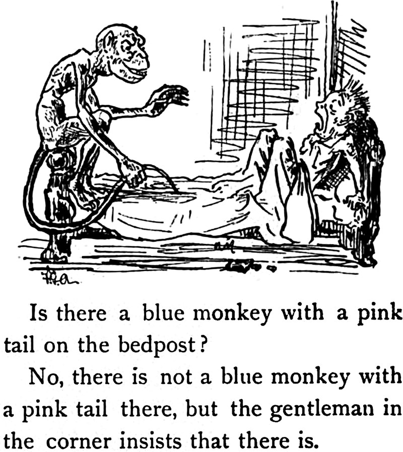 It isn't a blue monkey with a pink tail.  From The Harvard Lampoon, 1878.
