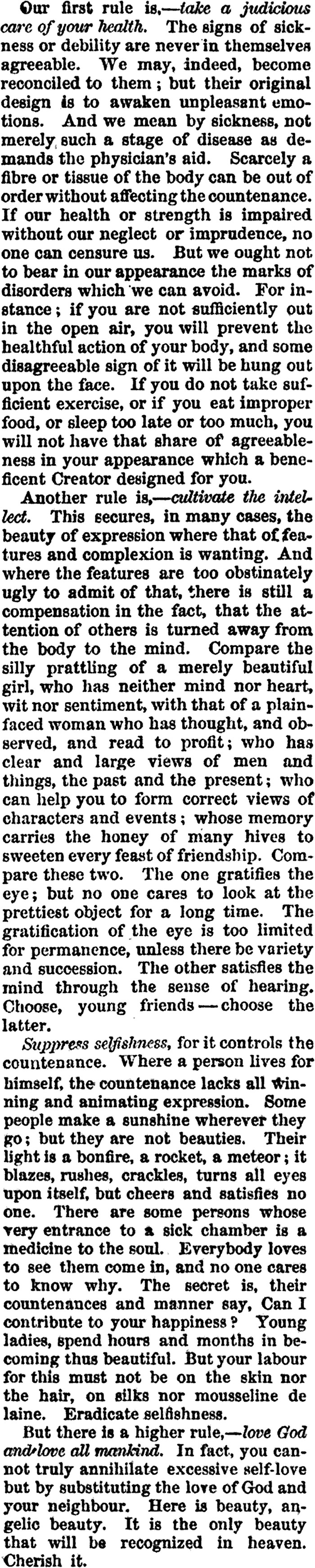 M. asked us, "How can one become physically beautiful at least for a brief moment before death." We find our four-pronged answer in E. N. Kirk's "How to Become Beautiful" (1846).