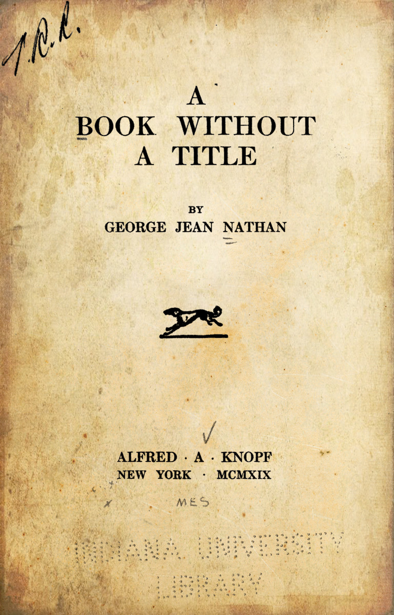 Here's A Book Without a Title by George Jean Nathan, 1918.  Its epigraph offers some explanation and/or confession: "'Titles of books: Decoys to catch purchasers.' —Chatfield."  Previously, we stumbled upon this other book that was printed without a title.