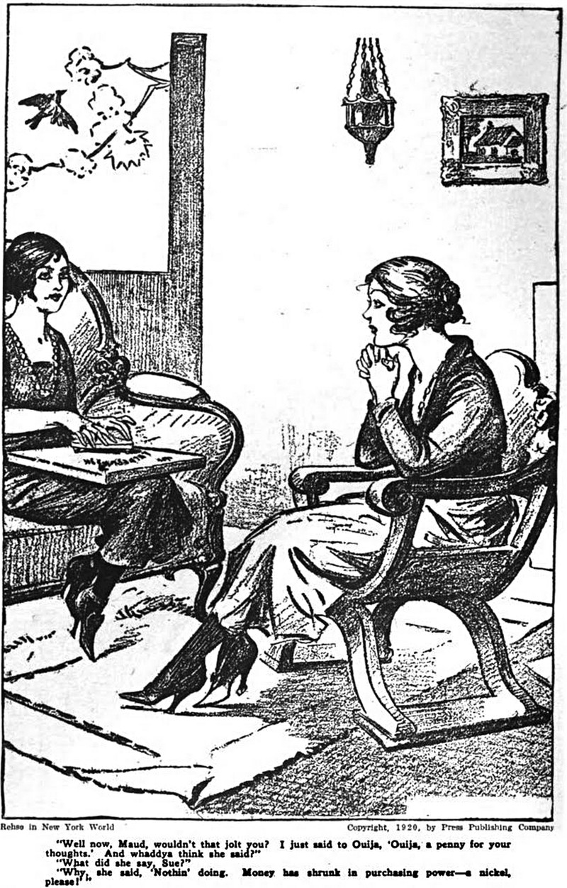 Inflation affects a Ouija board.  The Ouija was asked, "A penny for your thoughts," and it replied, "A nickel, please!"  From Cartoons Magazine, 1920.