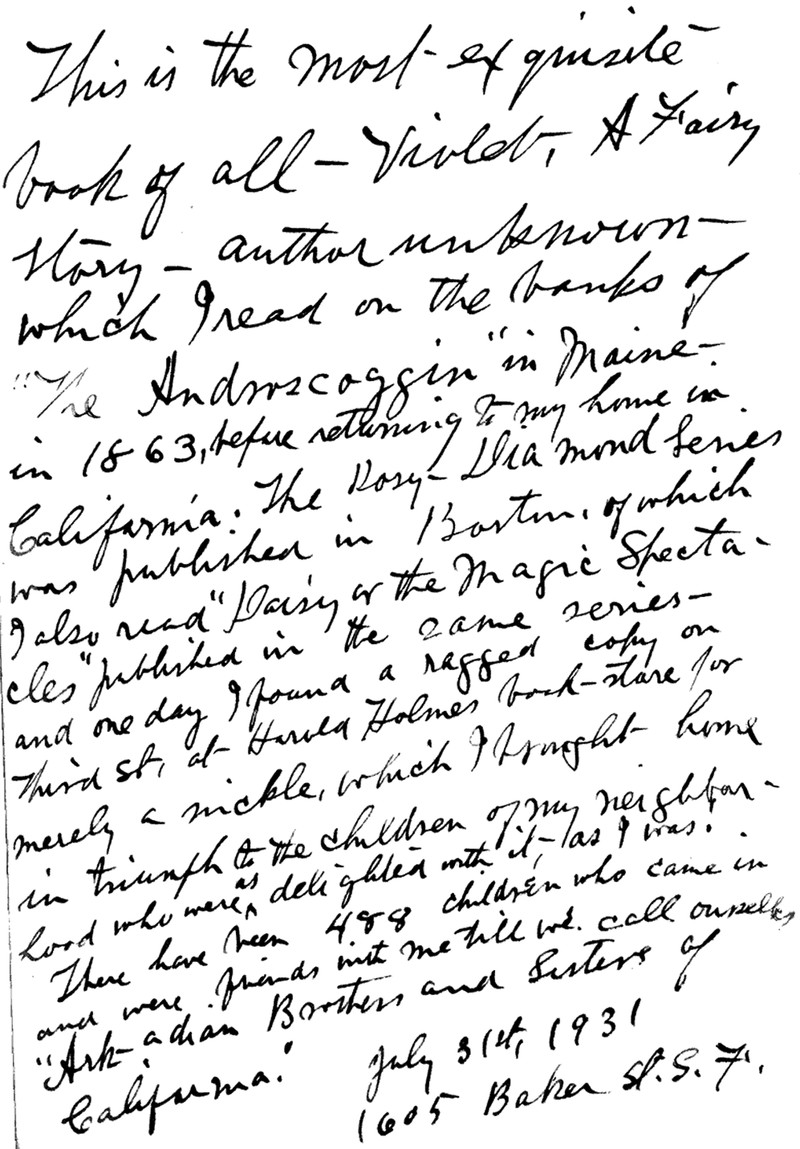 Violet: A Fairy Story (1855), calling it "the most exquisite book of all" and explaining how mutual appreciation of books of fairy tales united 488 young people into the "Ark-adian Brothers and Sisters of California."