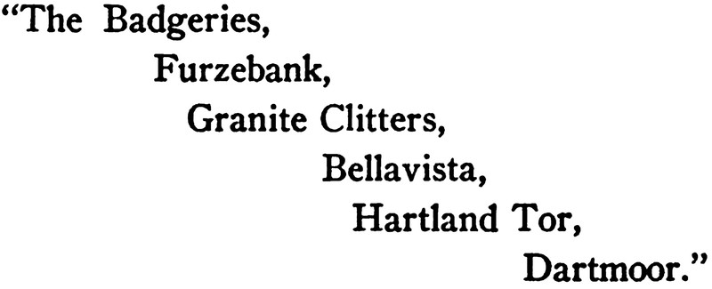 Here's an address from The Flint Heart by Eden Phillpotts, 1910.