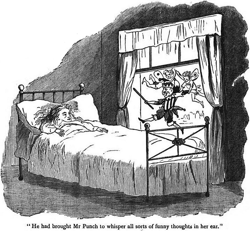 "He brought Mr Punch to whisper all sorts of funny thoughs in her ear."  From Golden Curl by F. A. E. A., 1882.