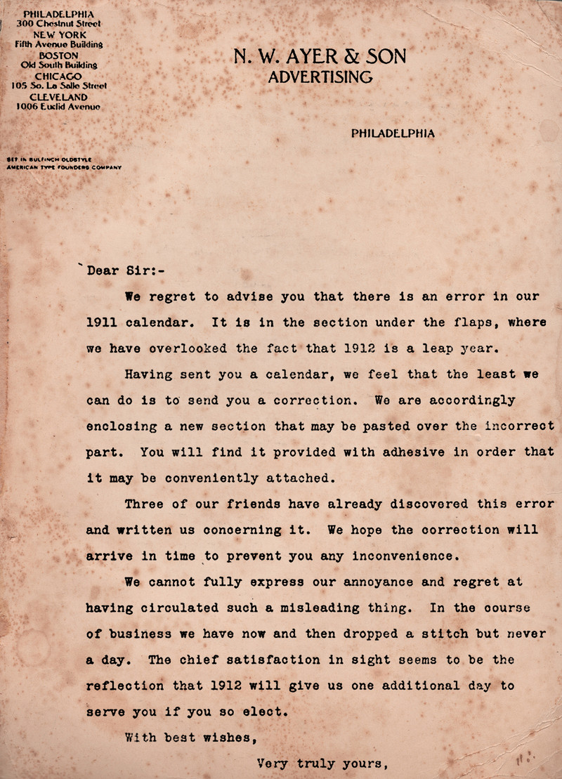 If you've ever made a mortifying mistake, recall the calendar maker who forgot about leap year.  From Letters that Make Good, 1915.