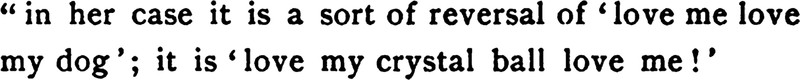 A reversal of "love me, love my dog": "Love my crystal ball love me."  From A Beginner by Rhoda Broughton, 1894.