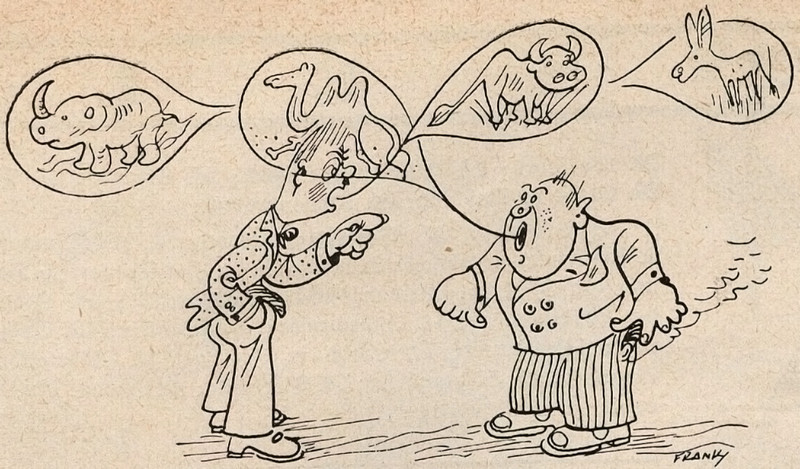 From Fliegende Blätter, 1934. These swear word animals are in German. The first one we translate as "son of a bitch," the rhino's horn referring to the sound of the German word "hurensohn." The camel can mean "idiot" in German. We presume the bull and the jackass have similar-enough meanings in German.