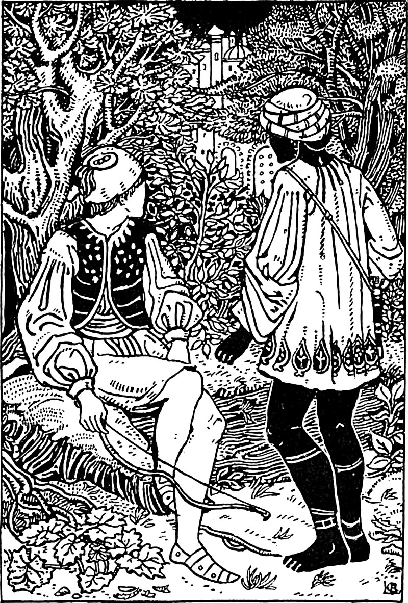 Facing the subjects away frees the illustrator from drawing facial features. From Turkish Fairy Tales and Folk Tales by Ignácz Kúnos and illustrated by Celia Levetus, 1896.