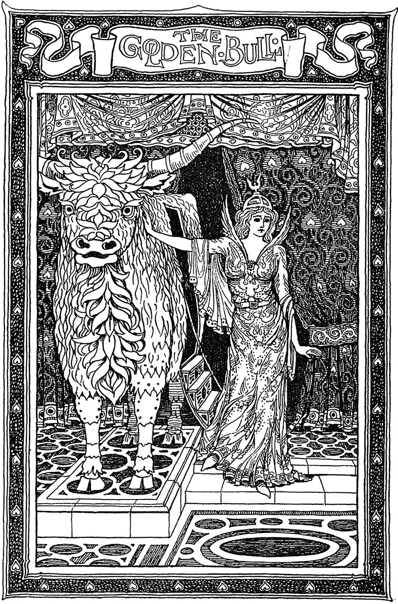 The golden bull.  From Old English Fairy Tales by Sabine Baring-Gould and illustrated by F. D. Bedford, 1895.