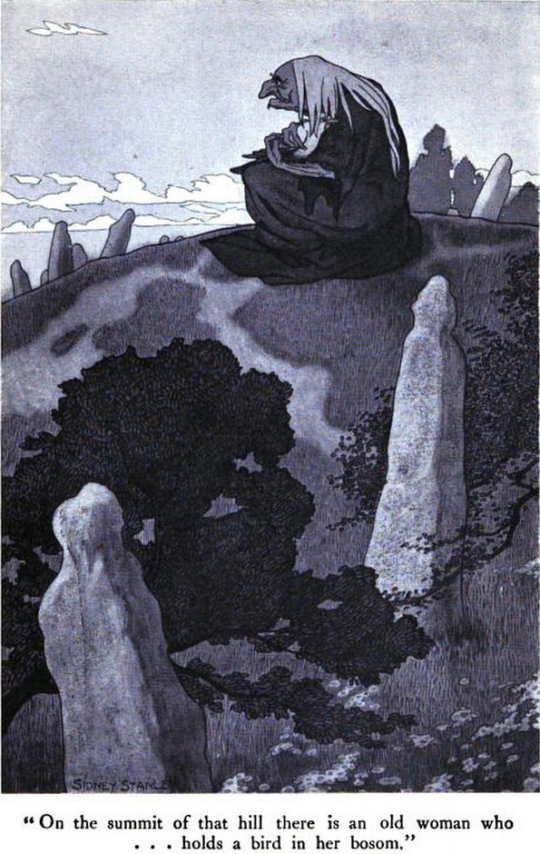 "On the summit of that hill there is an old woman who holds a bird in her bosom." From Serbian Fairy Tales by Elodie L. Mijatovich and illustrated by Sidney Stanley, 1921.