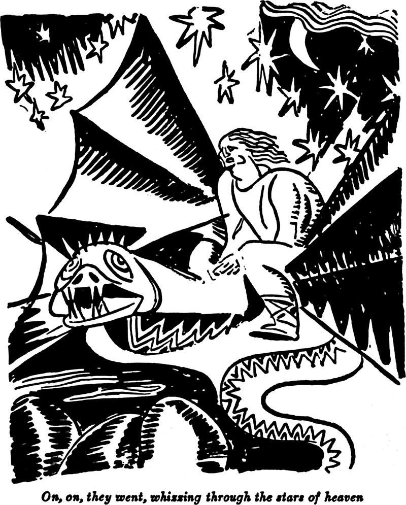 "On, on, they went, whizzing through the stars of heaven."  From The Shoemaker's Apron, A Second Book of Czechoslovak Fairy Tales and Folk Tales by Parker Fillmore and illustrated by Jan Matulka, 1920.