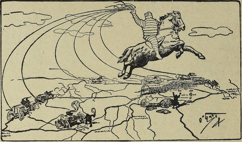 Though it looks like Bibendum is yanking up the lines of longitude from his flying horse, he's presumably pumping stranded motorists' flat tires. From Le Rire, 1905.