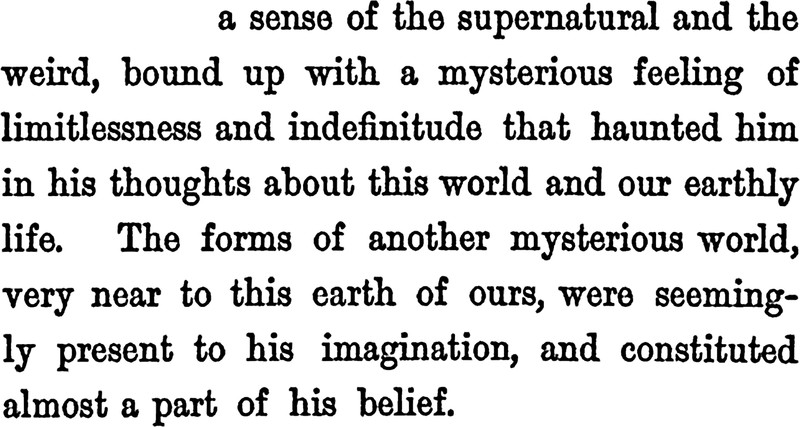 A sense of the supernatural and the weird, bound up with a mysterious feeling of limitlessness and indefinitude that haunted him in his thoughts about this world and our earthly life. The forms of another mysterious world, very near to this earth of ours, were seemingly present to his imagination. From