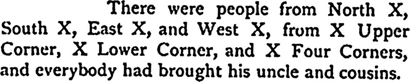 It's not as simple as X marking a spot on the map. "There were people from North X, South X, East X, and West X, from X Upper Corner, X Lower Corner, and X Four Corners, and everybody had brought his uncle and cousins." From St. Nicholas, 1879.