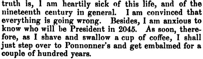 If you're heartily sick of this life, get emblamed for a couple hundred years. From "Some Words With a Mummy" in Tales of Mystery and Imagination by Edgar Allan Poe.