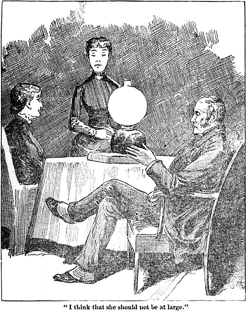 "I think that she should not be at large."  From Ballou's Monthly Magazine, 1886.