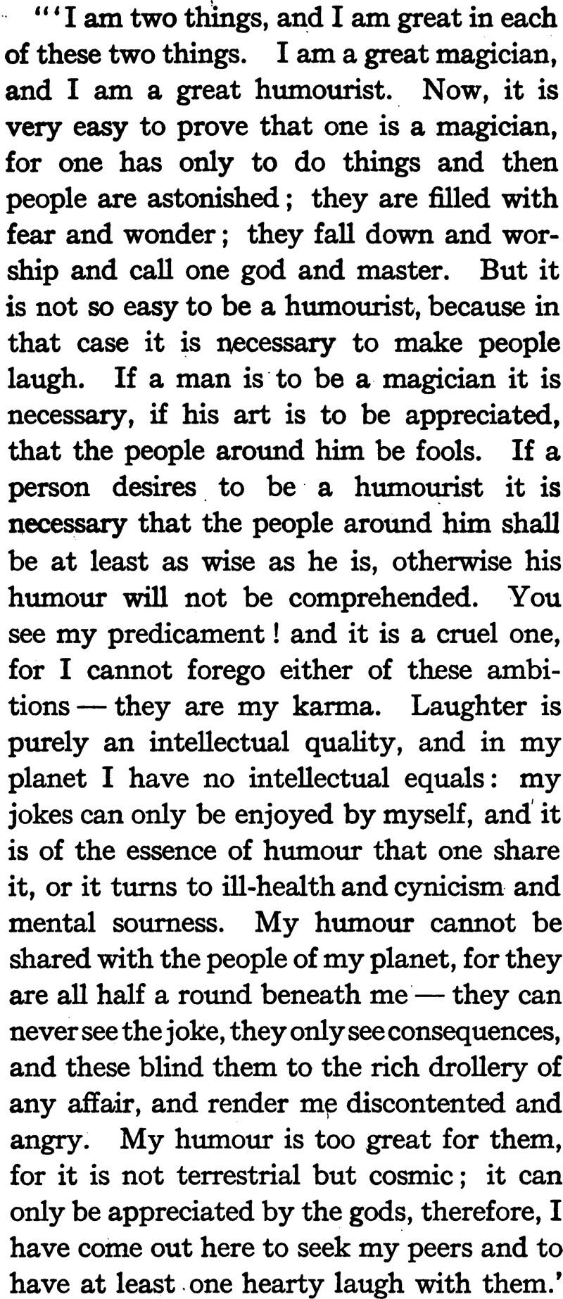 Here's the crucial difference between a humorist and a magician.  From the sublime novel The Demi-gods by James Stephens, 1921.