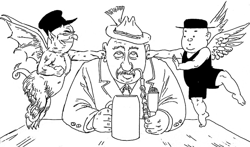 #vintage illustration #demon #imp #temptation #angel #good and evil #pipe smoker #illustration