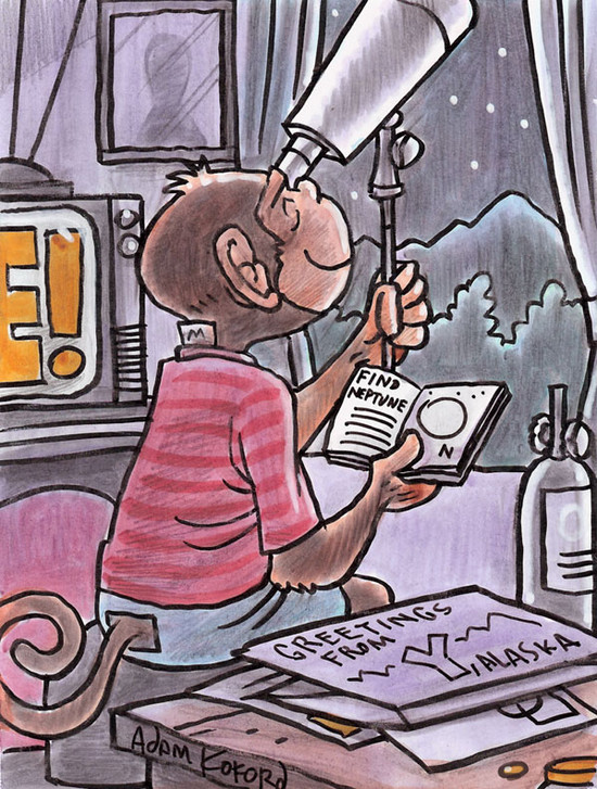 The artist explains that the one letter words depicted here (and probably indecipherable without this guide) include: M: as in medium t-shirt O: as in oxygen N: as in the planet Neptune K: as in vitamin K (the pill in the foreground) E: as in E! and Y: as in Alaska.