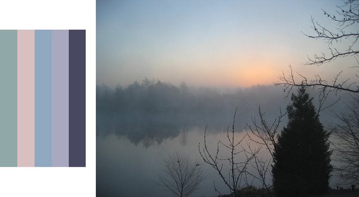 My "Bewildered Dawn" color palette takes its inspiration from the rising sun trying to penetrate a veil of early morning fog on a lake.