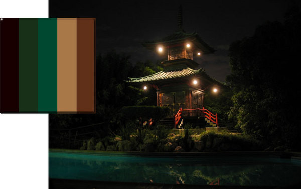 Re: the "Spooky Pagoda" palette, moonlight and lanterns illuminate the tiles, woods, and metal work of the oldest structure in Los Angeles—the pagoda at the pool of the