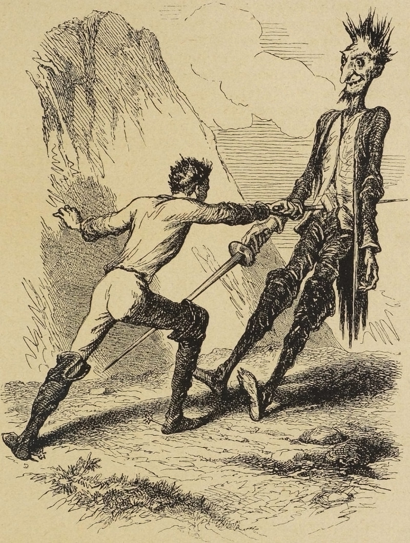 #vintage illustration #devil #giant #sword fight