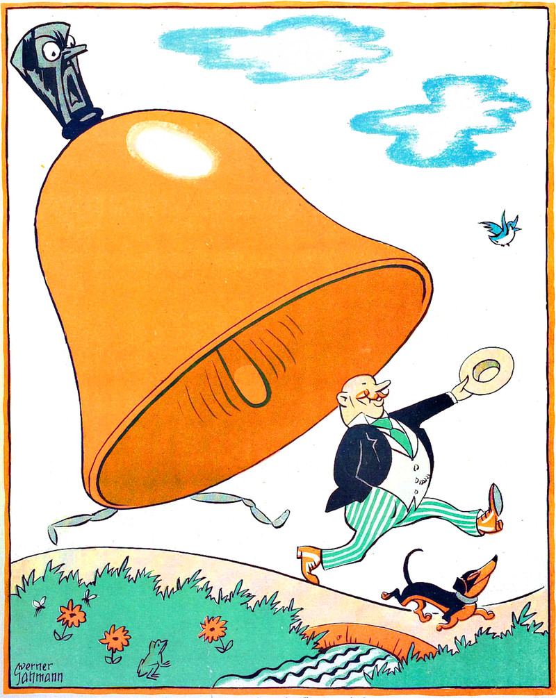 #vintage illustration #anthropomorphism #dog #faces in things #bell #walking the dog #giant bell #illustration #pet walker #dog walker