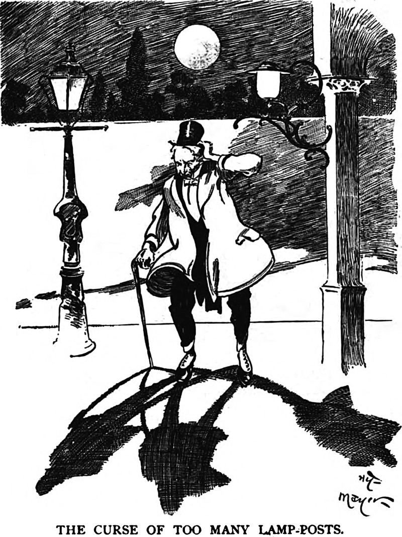 The curse of too many lamp-posts.  From Judge's Library, 1903.