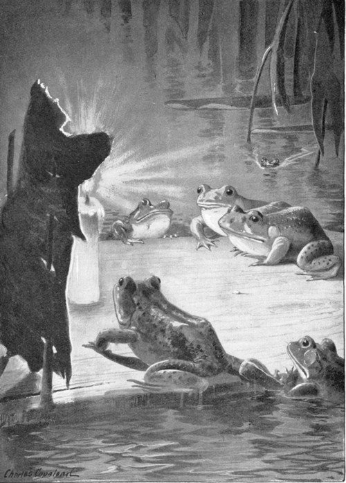 Soon two other points of light would come stealing in from the other side, and another frog would set his elbows on the float and stare hard across at the first-comer. And then two more shining points, and two more, till twelve or fifteen frogs were gathered about my beacon, as thick as they could find elbow room on the float, all staring and blinking like so many strange water owls come up from the bottom to debate weighty things, with a little flickering will-o'-the-wisp nodding grave assent in the midst of them. But never a word was spoken; the silence was perfect.