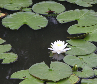 Theory: the Pac-Man video game was inspired by a lily pond. The lily pads, with their triangular missing pieces pointing toward colorful flowers, inspired the munching mouth who chases ghosts. When we flip Pac-Man art upside down, the ghost resembles a water lily blossom.