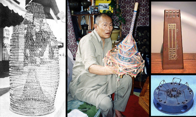 Answers and sources: Left, an octopus trap and shrimp transporter. Middle, a Bhutanese spirit trap. Top right, a rare tapering trapezoidal Roycroft copper vase. Bottom right, an unusual antique mouse trap with five holes.