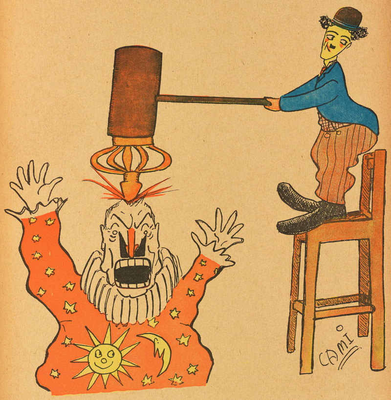 #vintage illustration #crown #clown #charlie chaplin #sledgehammer #1910s