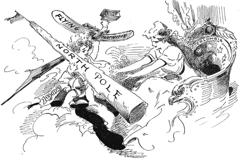 The new year offers gifts of the north pole and a flying machine.  From The Judge, 1909.