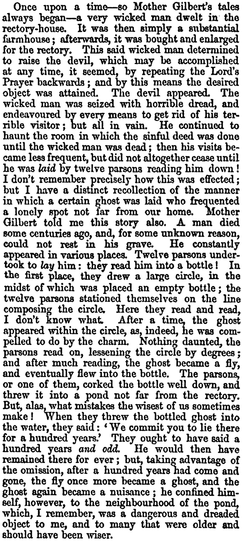 Here's an anecdote about how a restless spirit was charmed into the shape of a fly and read into a bottle by 12 parsons standing in a circle. Note how the parsons made a mistake when they threw the bottled ghost down a well: they committed it to lie for a hundred years, forgetting to specify "a hundred years and odd," thereby allowing the ghost the escape in due time. From Chambers's Journal, 1866.