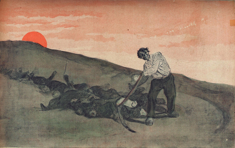 #vintage illustration #death #grim reaper #scythe #sunset #red sky