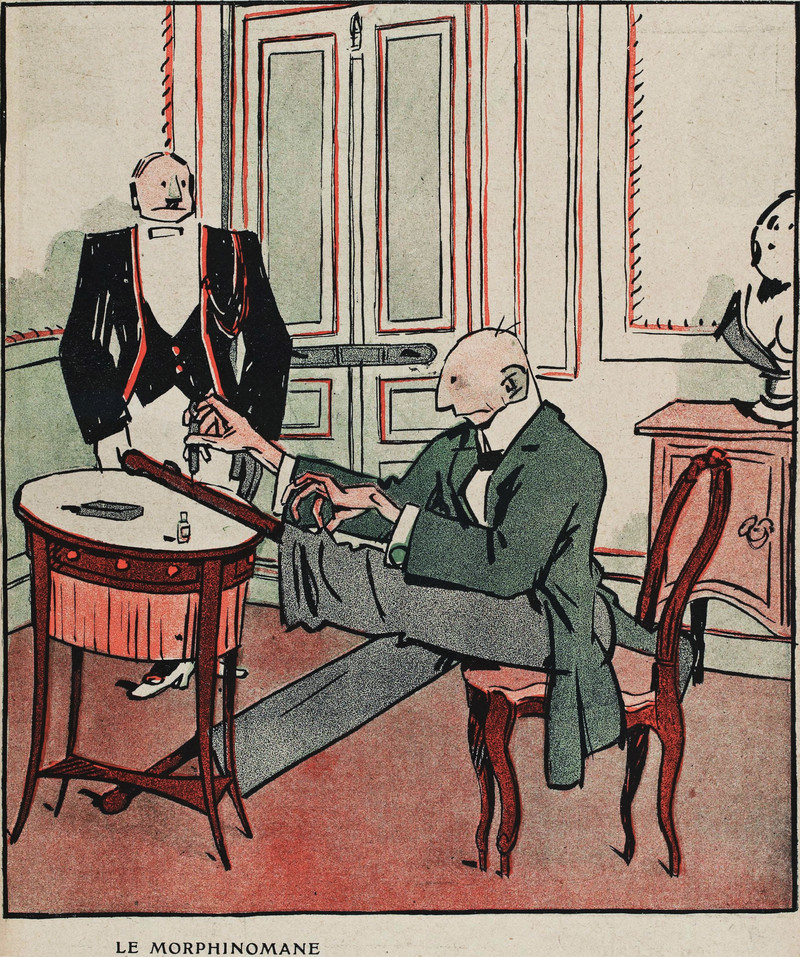 Injecting morphine into his wooden leg.  From L'Assiette au Beurre, 1909.