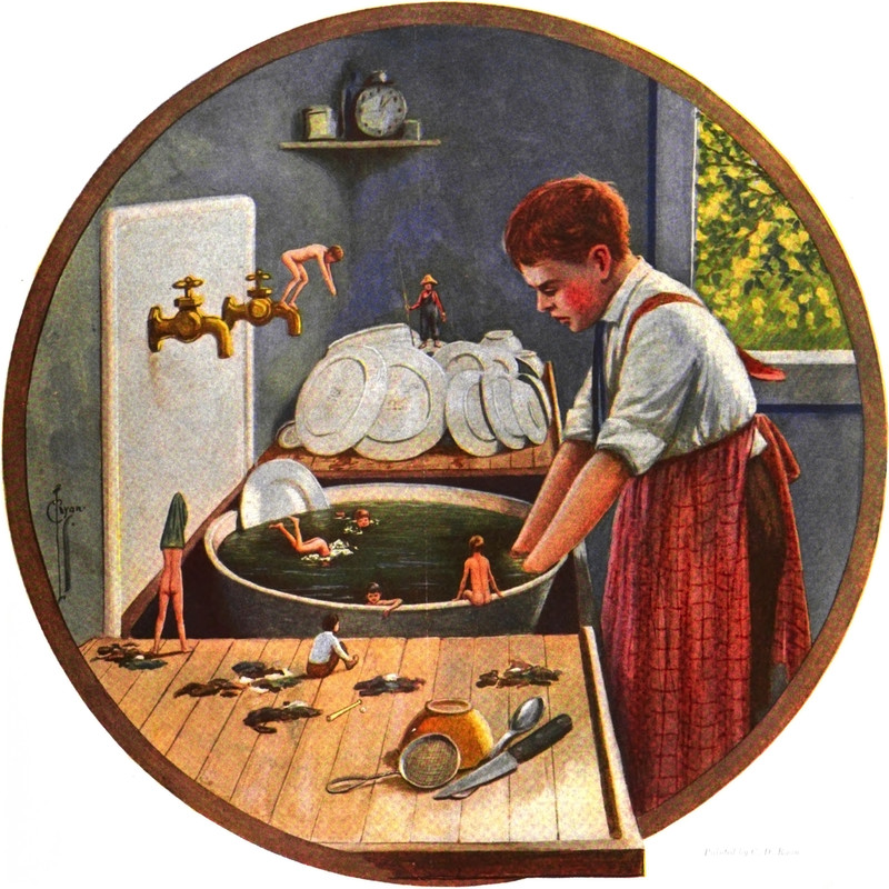 #vintage illustration #tiny people #dirty dishes #washing up #swimming hole #art