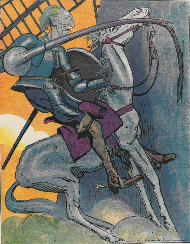 #vintage illustration #horse #knight #windmill #don quixote #jousting #up against it #hitting a wall