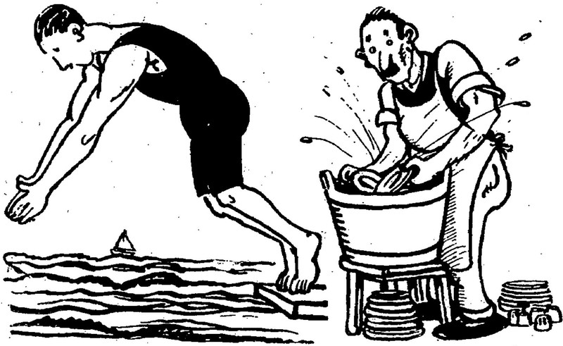 Two types of plunging, only one of them a sport.  From Le Journal Amusant, 1920.
