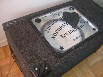 Artist Jon Sasaki modified a subwoofer to vibrate a Ouiji pointer over a Ouiji Board, "spelling out the sinister directives that have been encoded in all popular music as subliminal messages." See a video of the device in action!